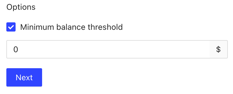 If you like to set a “Minimum, Balance Threshold” click on the small box and set an amount. Once you are done click on “next” to go to step 2