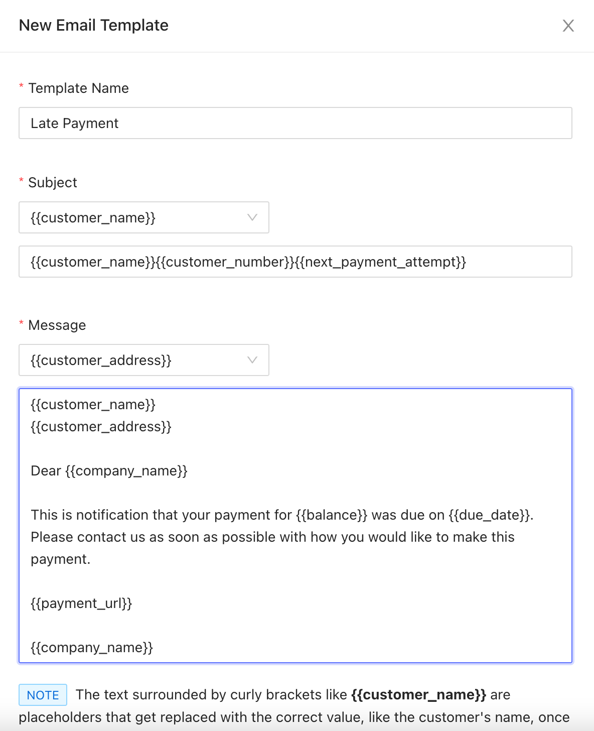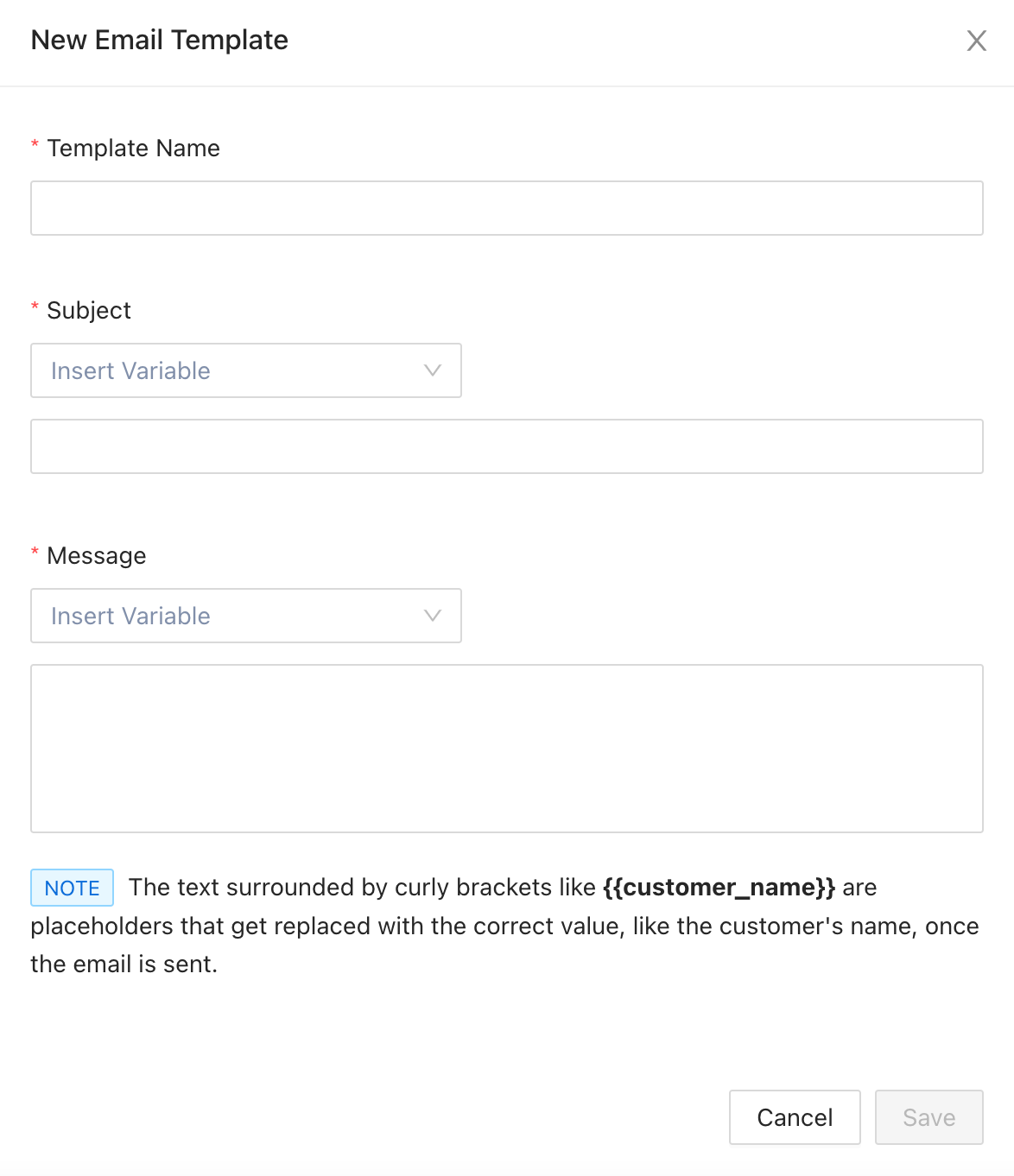 You can fill out the Template Name, Subject, and Message. You can combine your own words or your predefined criteria using the drop down menu along with your message.