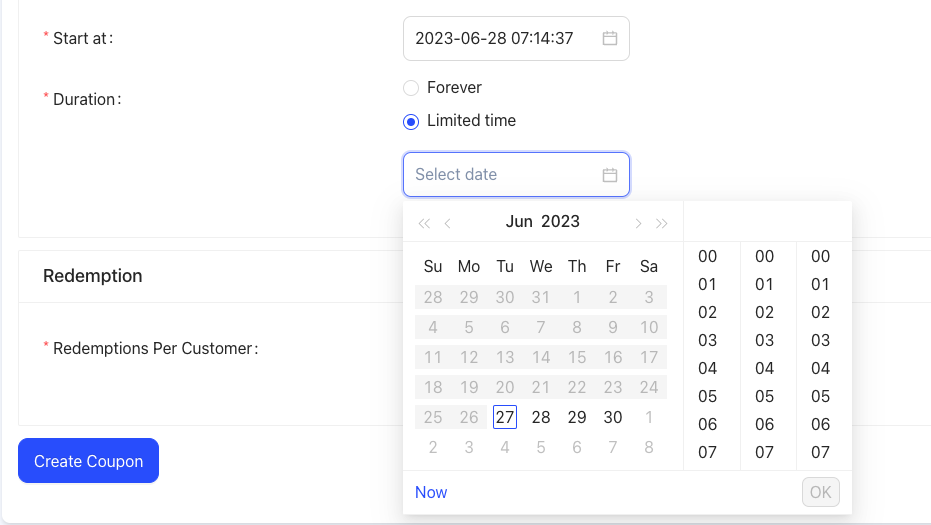 When creating or updating a coupon, you can select the desired start date. This determines when the coupon becomes active and available for customer use.