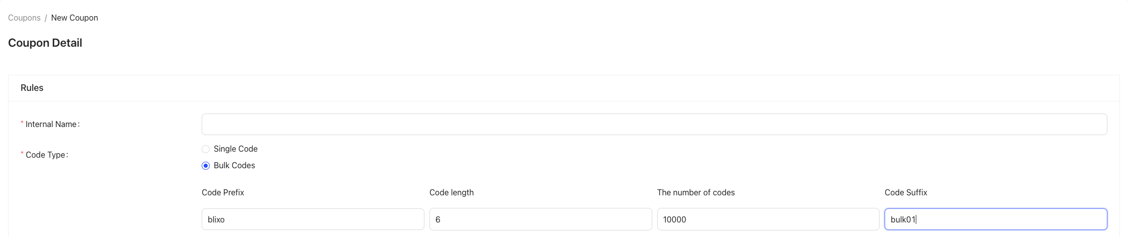 Bulk Coupons consist of multiple unique codes. You have the flexibility to specify the number of codes you want to generate for a bulk coupon. Each unique code in a bulk coupon can be redeemed only once. Additionally, there is support for generating bulk coupons with a prefix and suffix. This allows you to customize the codes generated for bulk coupons.