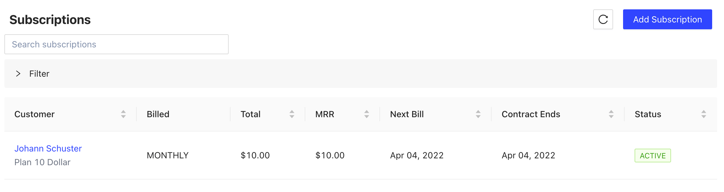 From this list if you click on the customer’s name you will get a page with all the customer’s subscription information.