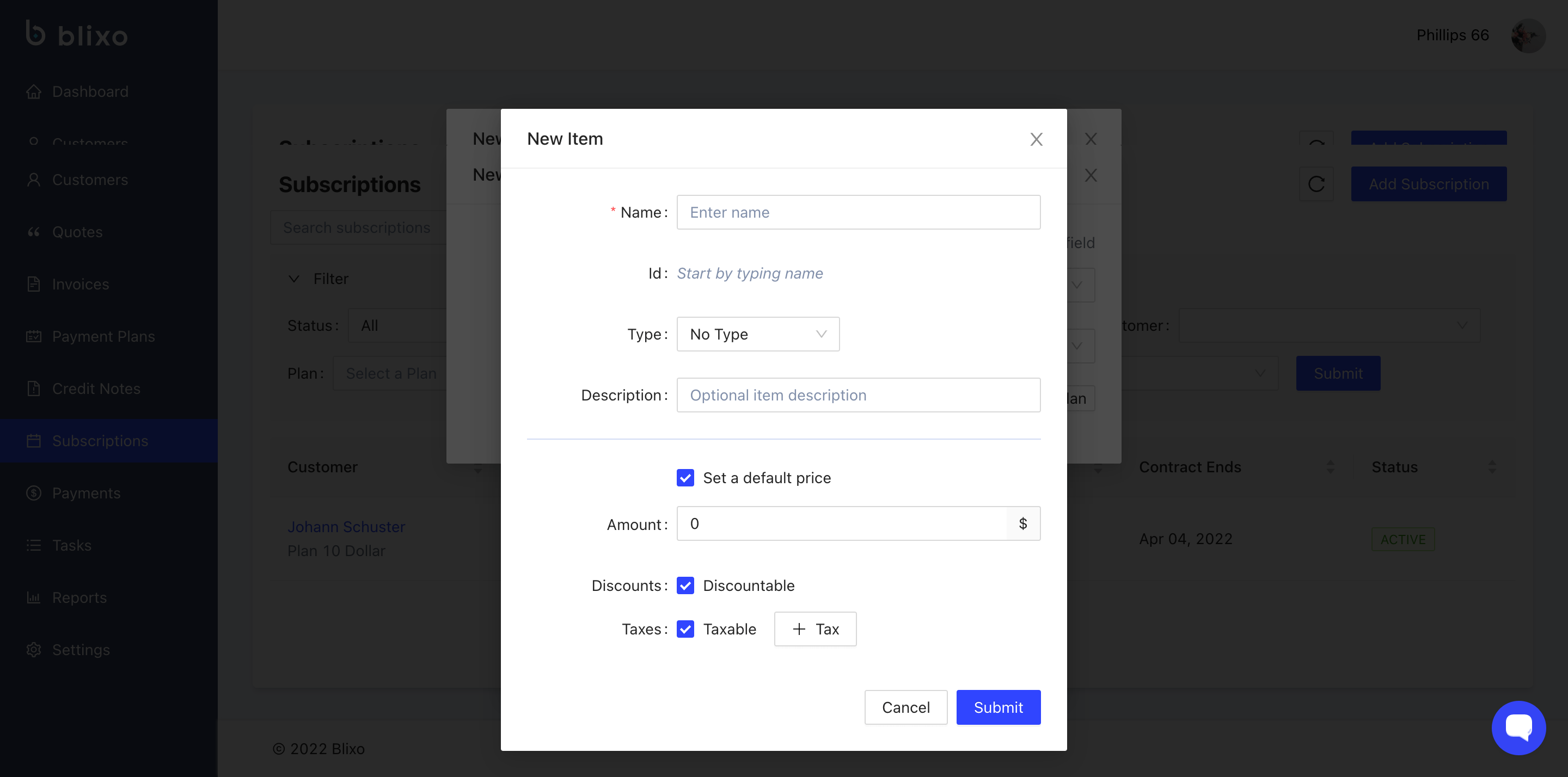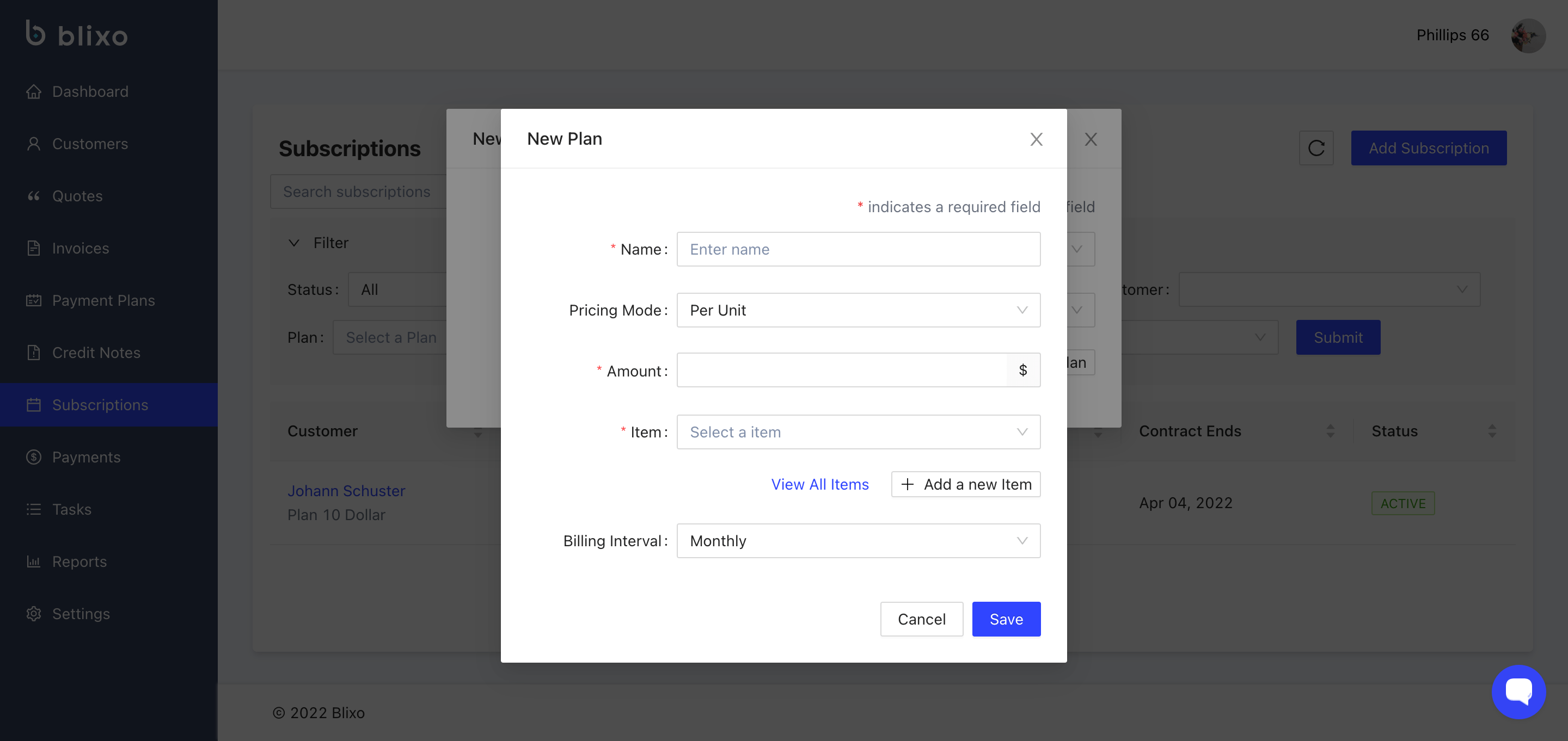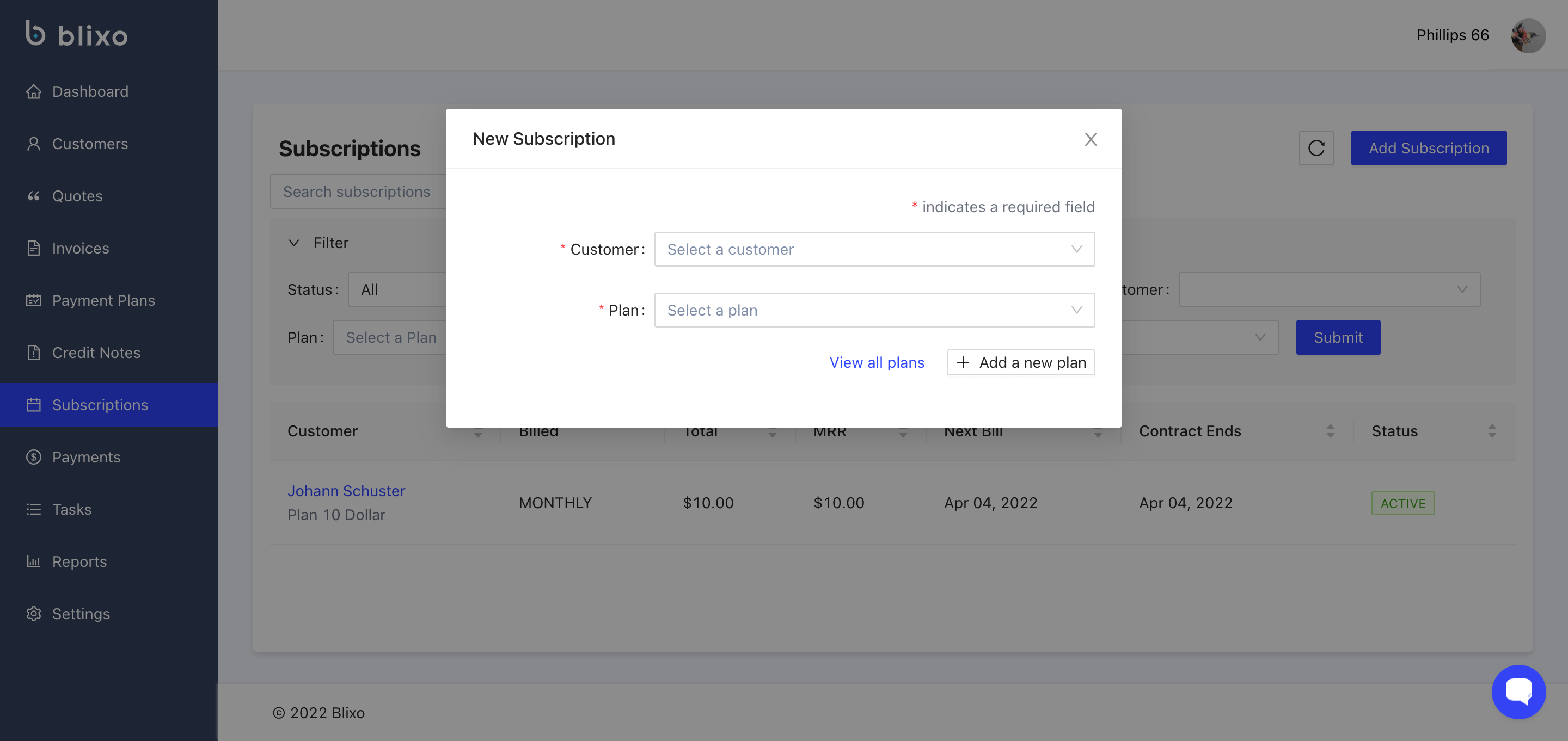 Here you can choose which customer (list is from your previous entered Customers) and then either choose a subscription plan from the “Plan” drop down menu or create a new plan by clicking on “+Add a new Plan”